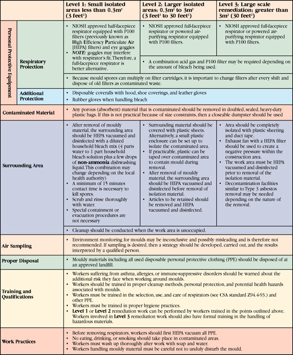 How can moulds be safely removed?Toxic moulds must be removed. However, special control measures must first be implemented to prevent worker exposure and the spread of moulds from the construction area to adjacent areas. This is especially true for Stachybotrys because of its potentially severe health effects. The extent of contamination governs what remediation measures need to be taken in order to prevent the spread of toxic moulds. Note: The cause of moisture problems should be corrected before any mould remediation takes place. A follow-up inspection should be conducted 3-6 months after remediation to ensure that the mould has not returned. Health Canada and the New York City Department of Health have both produced documents on the assessment, remediation, and management of fungal contamination. The table below summarizes their recommendations with minor updates to reflect current best practices. The Canada Mortgage and Housing Corporation is developing comprehensive cleanup procedures for toxic mould. The document is still in draft form and not yet publicly available. Obligations under the ActAlthough there are no Ontario regulations specifically addressing moulds, an employer must, under the Occupational Health and Safety Act, take every precaution reasonable in the circumstances for the protection of a worker. Work practices set out by Health Canada in Fungal Contamination of Public Buildings: A Guide to Recognition and Management provide a reasonable standard. Employers have a duty to instruct workers in the safe removal and handling of mould-contaminated material. Workers in turn have the duty to follow these instructions. Building owners must ensure that trade contractors follow proper remediation procedures. The following table is intended only as a summary of remediation procedures and is not intended, nor should it be used, as a guideline for mould removal. For that purpose, refer to